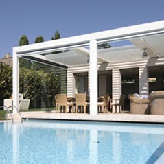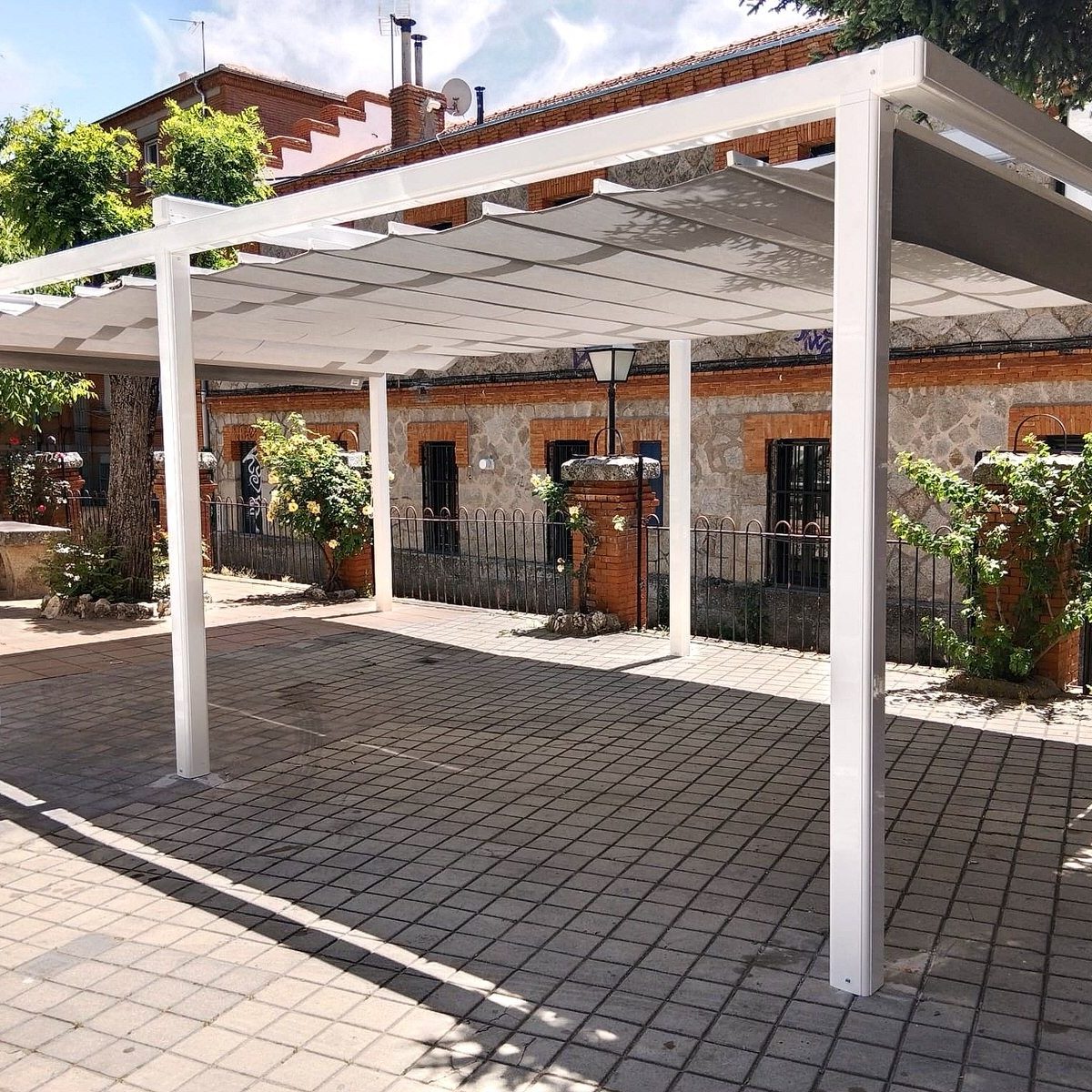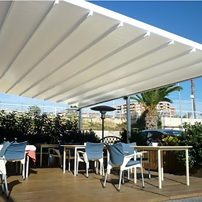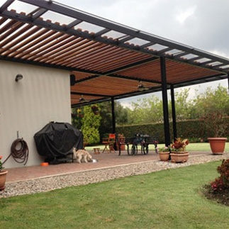 Estructuras tipo pérgola, con apertura y cierre de lona tipo acordeón, manejo manual o motorizado, lona acrílica con vida útil a exterior de 15 a 18 años.